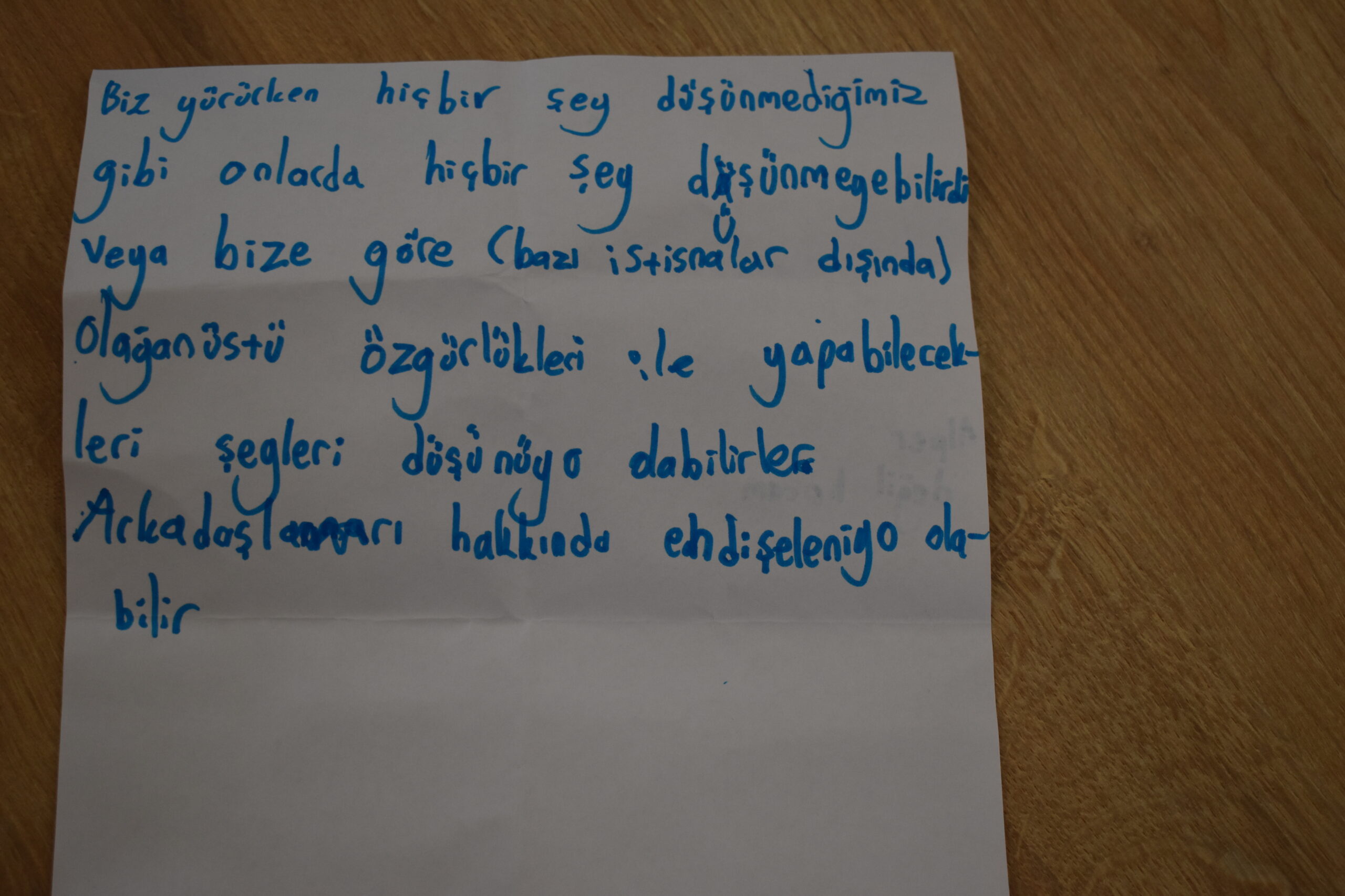 “Kuşlar bizi izliyor olabilirler. İnsanların ne yaptığını, hareket ettiğini görebilirler. İnsanlar neden çevreyi kirletiyorlar diye düşünüyorlardır.”